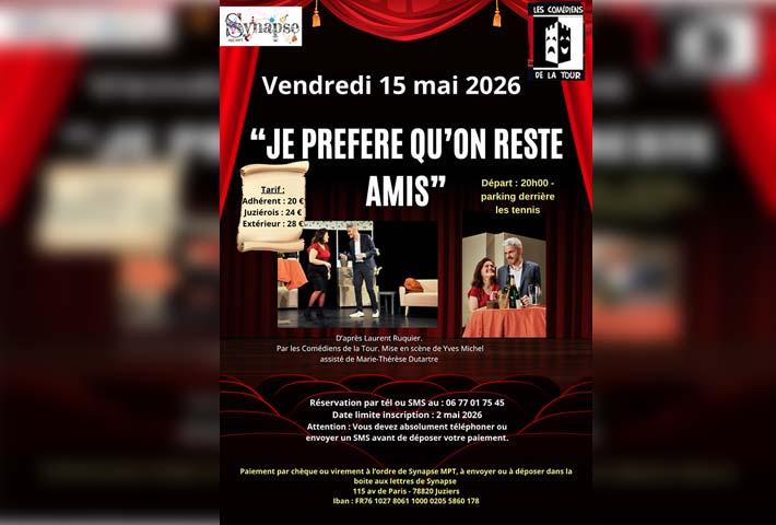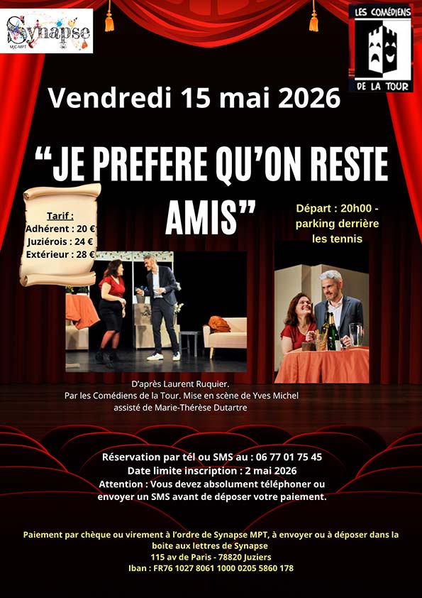 Paiement par virement ou chèque à l’ordre de Synapse MPT, à envoyer ou à déposer dans la boite aux lettres du 115 avenue de Paris/ Juziers.